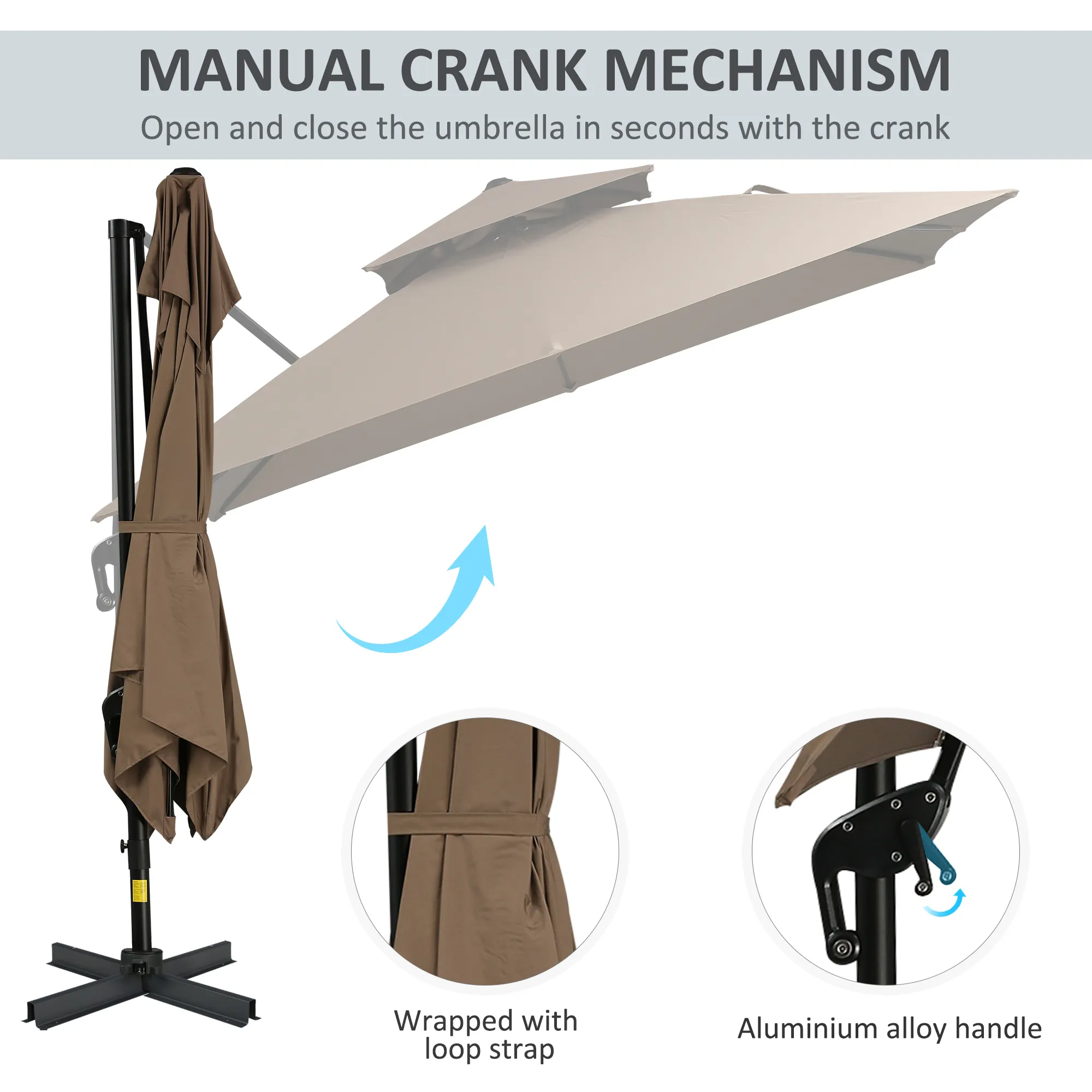 Need shade but nowhere to mount an umbrella? Use a cantilever for your outdoor couch, pool chairs, and more. Say goodbye to sunburns this summer with Outsunny. This outdoor offset umbrella offers you ample shade from UV at an angle you control. Swivel the umbrella stand to shade anywhere across a full 360 degrees. Its double top allows cool airflow, the aluminum frame is naturally water safe, and it includes a cover. Don't get upset with your umbrella; get an offset umbrella, get Outsunny. Features: - Outdoor offset umbrella to provide shade and protect you from the sun - Double top provides ventilation - Canopy rotates 360 degrees by the pedal to cover you as the sun moves - Umbrella straps shut - Cover included - Crank handle to quickly open and shut - Naturally water-safe aluminum pole, with eight connecting ribs for extra stability - The five-position tilt canopy - Assembly required Specification: - Color: Coffee - Materials: Steel, Aluminum, Polyester, PE - Overall Dimensions: 9.8' L x 9.8' W x 8.9' H - Small Top Diameters: 3.3' L x 3.3' W - Aluminum Column: 2" L x 2.75" W - Cross Stand Dimensions: 3.3' L x 3.3' W - Umbrella Cover Dimensions: 1.8' L x 6.9' W - Note: Use the umbrella cover to protect your umbrella when not in use - Note: Please weigh the umbrella down. Weight is not included Package Includes: - 1 x Cantilever Umbrella with Cross Base - 1 x Umbrella Cover - 1 x Manual.