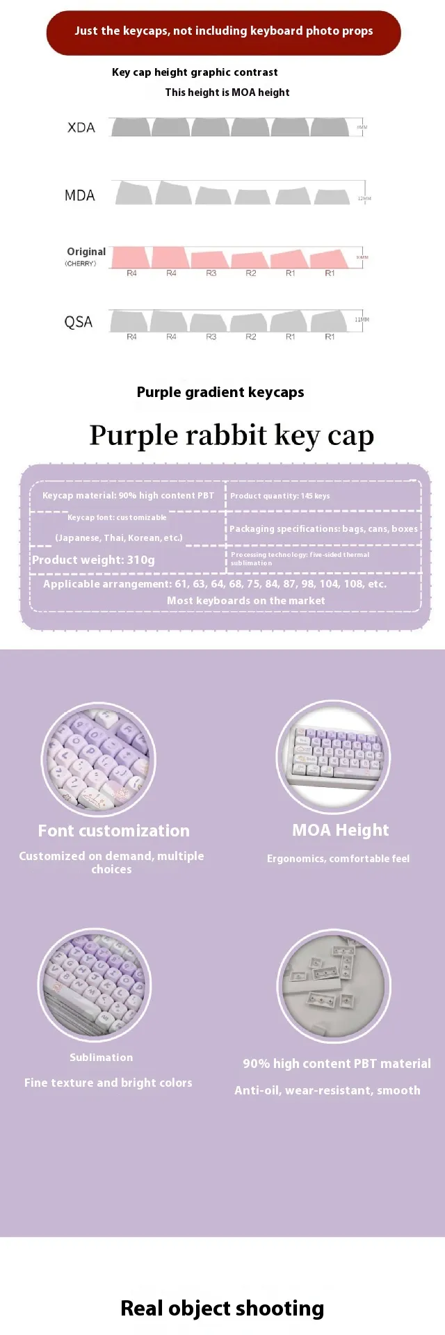 The PBT (Polybutylene Terephthalate) material used in these keycaps ensures durability, wear resistance, and a satisfying feel with every keystroke. Unlike ABS keycaps, PBT keycaps are resistant to fading, oils from your fingers, and shine over time. This means your Gradient Purple Rabbit Key Caps will maintain their vibrant look and smooth texture, even after extensive use.