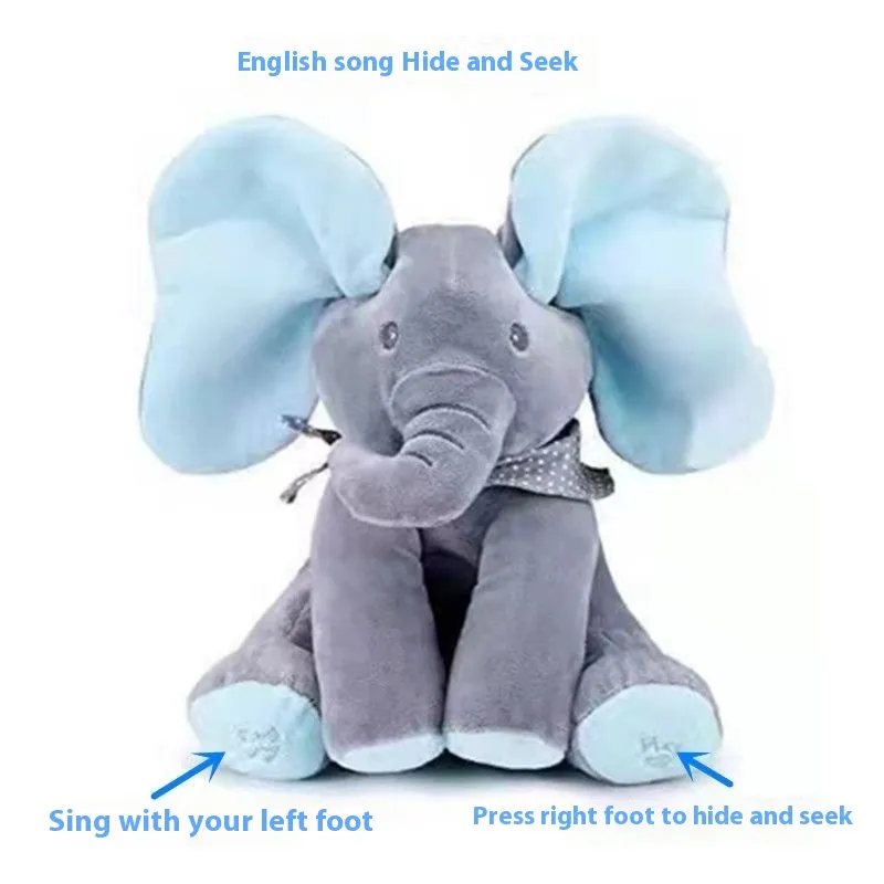 - ENGAGING INTERACTIVE PLAY: This animated elephant stuffed animal features two captivating play modes with adjustable volume. Press the right foot to hear cheerful songs, including the popular 'ABC song,' and press the left foot for a delightful peek-a-boo elephant toy game, where the ears playfully hide his eyes.