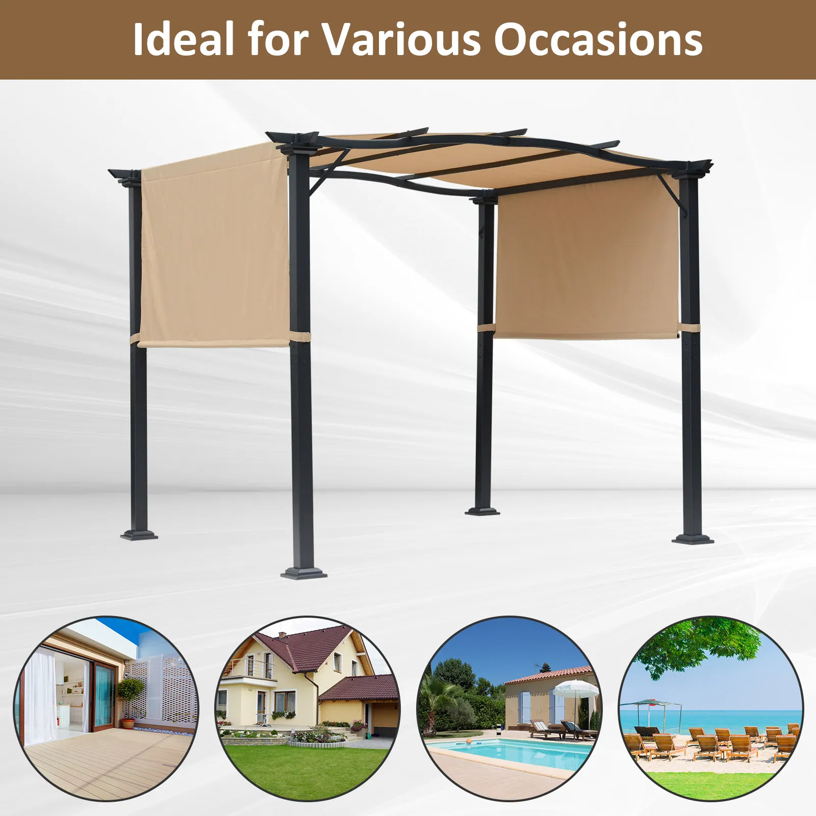 This steel pergola allows you to adjust the canopy as you desire to enjoy the sunshine or relax in the shade of deck gazebo. Create an amazing private space where you can feel the breeze in your hair and the gentle sunshine on your skin. A place where you can enjoy some fantastic shade while you drink a cold beverage on a hot day. Add this durable and affordable corner pergola to your backyard or patio and enjoy the terrific luxury it brings to your outdoor living space. Features: - Canopy can be retracted to let the sunlight in or to keep a shaded area - It fits both rainy and sunny days - Steel frame with reinforced top beam ensures long-lasting use - Supporting rails and pipes attached make the structure sturdy and strong - Suitable for many places - Straps for conveniently fixing onto the frame - Affordable in view of its practicality and stylishness - Simple assembly required Specification: - Color: Khaki - Material:Steel, Polyester Fabric - Overall Dimensions: 9.7' L x 8' W x 7.5' H - Eaves Height: 7.1' - 7.4' - Canopy Length: 15.4' - Strap Dimensions: 7.75" L x 1.75" W - Foot Size: 7" L x 7" W - Column Spacing: 8.4'L x 6.4'W (divided into 2 pieces) - Column Spacing: 8.2' L x 6.6' W - Eave Width: 5.5" If you're going grilling, that doesn't mean you need to bear sunburns and glare. Master the sun with this adjustable patio pergola. Send shade where you need it. Cover the top, side, both, or let it shine. It's all up to you. Design a dining area, deck it out in decor or layout lounge furniture. The strong steel frame resists bending and holds up under pressure. No matter your needs, get out, get Outsunny. Features: - 10' pergola canopy creates a spacious and comfortable place - Set the shade to the side of your liking - Sturdy bend resisting steel - PA coated polyester canopy protects from UV without fading - Equipped with eight support stakes for stability - Great for the backyard, garden, lawn, and other outdoor spaces - Assembly required Specification: - Color: White, Black - Material: Steel, Polyester - Overall Dimensions: 9.8' L x 9.8' W x 7.4' H - Eaves Height: 7.2' H - Column Spacing: 8.3' L x 8.3' W - Item Label: 84C-282WT Note: Avoid extreme weather such as floods, strong wind, and snow Package Includes: - 1 x Gazebo - 8 x Support Stake - 1 x Manual If you're going grilling, that doesn't mean you need to bear sunburns and glare. Features: - 10' pergola canopy creates a spacious and comfortable place - Set the shade to the side of your liking - Sturdy bend resisting steel - PA coated polyester canopy protects from UV without fading - Equipped with eight support stakes for stability - Great for the backyard, garden, lawn, and other outdoor spaces - Assembly required Specification: - Color: Beige, Black - Material: Steel, Polyester - Overall Dimensions: 9.8' L x 9.8' W x 7.4' H - Eaves Height: 7.2' H - Column Spacing: 8.3' L x 8.3' W - Item Label: 84C-282BG Note: Avoid extreme weather such as floods, strong wind, and snow Package Includes: - 1 x Gazebo - 8 x Support Stake - 1 x Manual Add some style and flair to your backyard by bringing home this unique and practical gazebo by Outsunny! Our patio pergola's large size and footprint offer plenty of room to comfortably set up a full dining table or seating underneath, giving you great flexibility. The steel frame ensures firm support, while the retractable pergola canopy allows you to open and close it to let sunlight in as needed. Make sure and check out this unique deck gazebo and make your life much more comfortable. Features: - UV-resistant polyester canopy roof blocks most harmful rays - Sturdy steel frame for great stability - Easy sliding canopy allows you to find the perfect amount of sun or shade - Slotted design can fix the canopy in position - Ideal for the porch, patio, backyard, or any outdoor space - Assembly required with all necessary hardware included Specification: - Color: Beige, Black - Material: Steel, Polyester - Overall Dimension: 11.3' L x 11.3' W x 8.2' H - Column Spacing: 9.8' - Steel Feet Size: 5" L x 5" W - Item Label: 84C-243V02BG Package Includes: - 1 x Pergola - 1 x Manual - 8 x Ground stakes Add some style and flair to your backyard by bringing home this unique and practical gazebo by Outsunny! Features: - UV resistant polyester canopy roof blocks most harmful rays - Sturdy steel frame for great stability - Easy sliding canopy allows you to find the perfect amount of sun or shade - Slotted design can fix the canopy in position - Ideal for the porch, patio, backyard, or any outdoor spaces - Assembly required with all necessary hardware included Specification: - Color: Gray, Black - Material: Steel, Polyester - Overall Dimension: 11.3' L x 11.3' W x 8.2' H - Column Spacing: 9.8' - Steel Feet Size: 5" L x 5" W Package Includes: - 1 x pergola - 1 x manual - 8 x ground stakes.