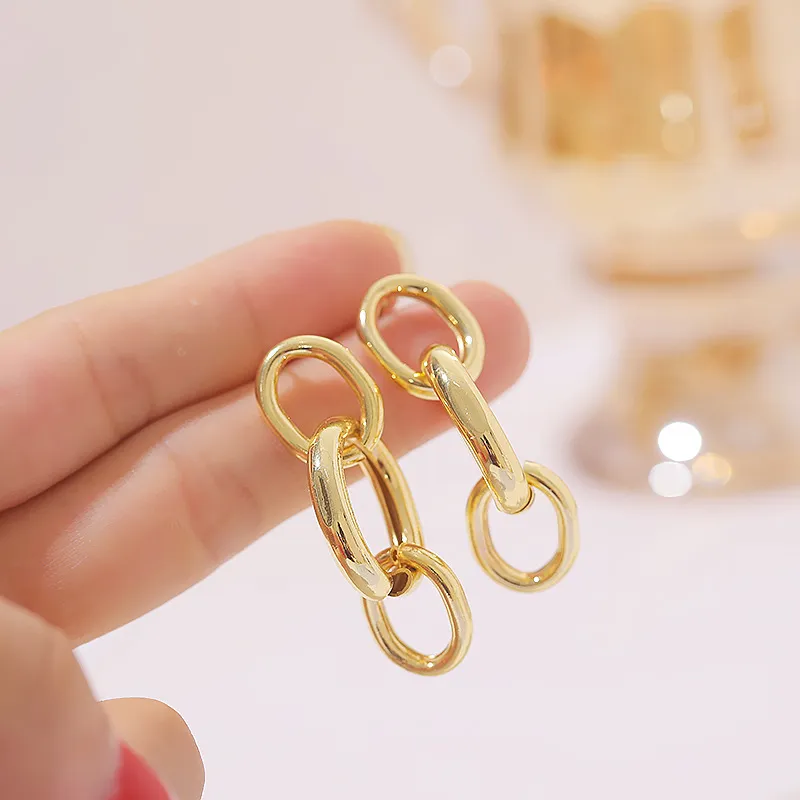 The chain design in these earrings adds texture and movement, making them a visually dynamic accessory. Chains have long been a symbol of strength and unity, and when integrated into jewelry, they create a look that is both stylish and meaningful. The links of the chain are carefully designed to ensure fluidity and elegance, creating a lightweight yet bold piece that catches the eye with every turn of your head.The chain design gives the earrings a sophisticated, minimalist appearance, making them perfect for pairing with both casual and formal outfits. Whether worn alone or layered with other earrings, the chains will add a touch of refinement to any look.
