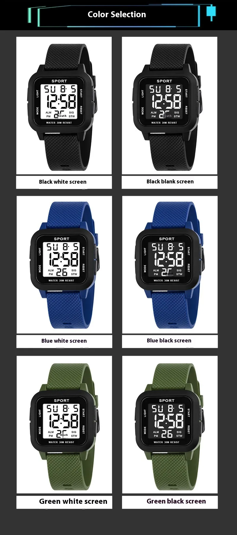 Color: Black Screen, Blue Screen, Green Screen, Watch Box, Bracelet