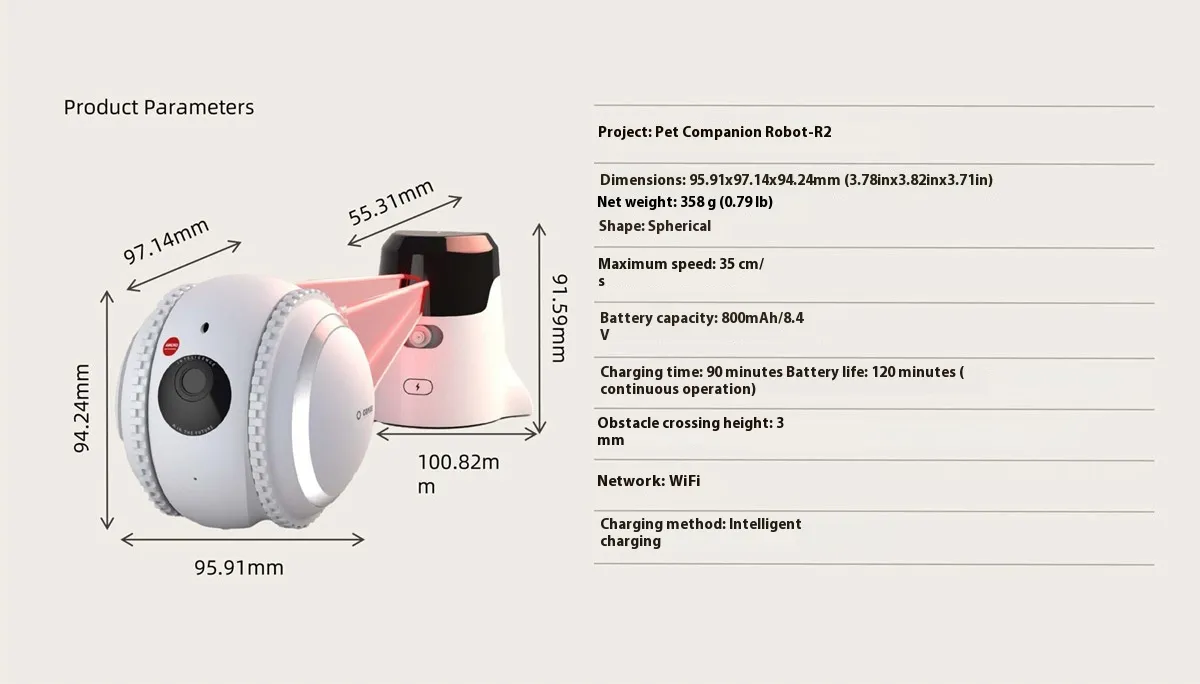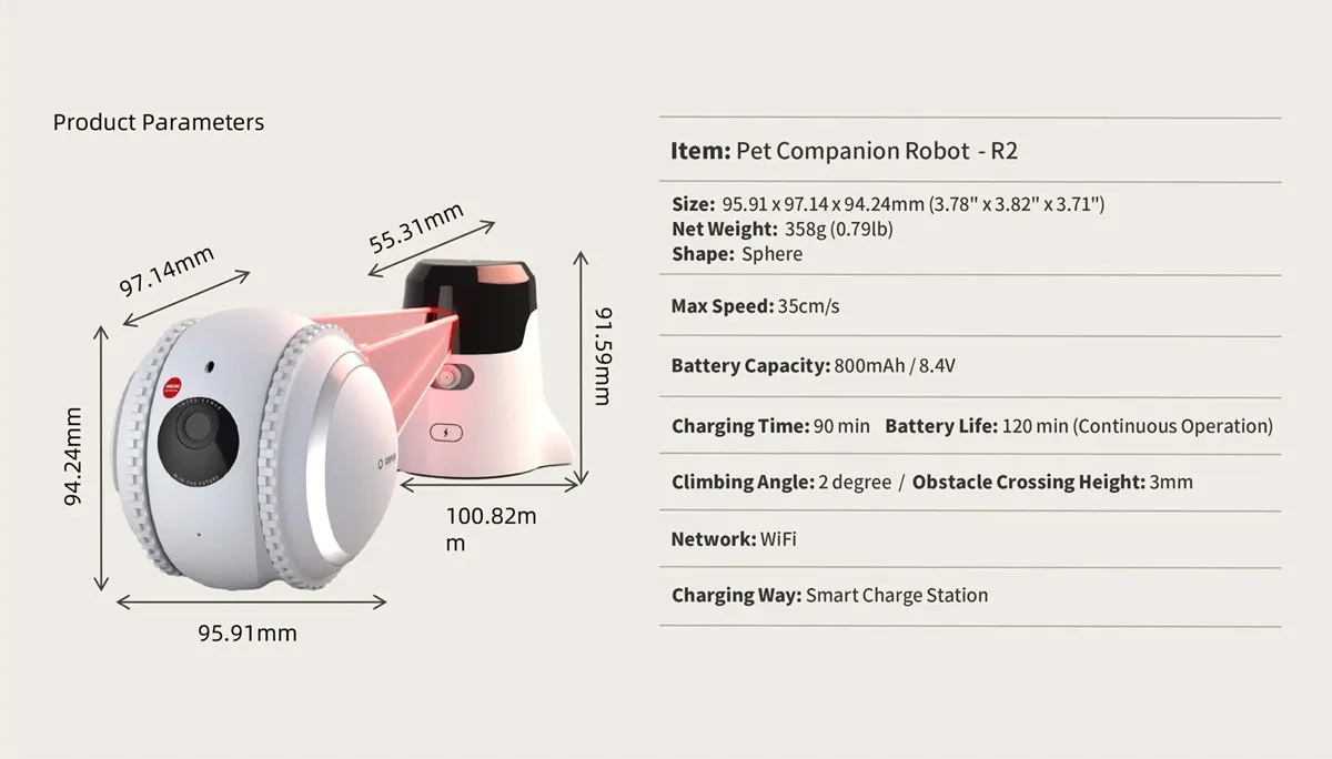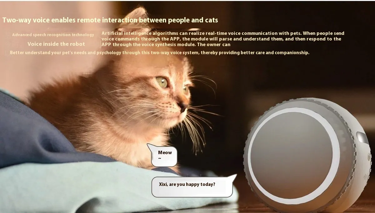 Introducing the Pet Companion Robot with Cat Monitoring, an innovative device designed to enhance the lives of both you and your feline friend. This state-of-the-art robot combines interactive play, health monitoring, and seamless connectivity to ensure your cat remains happy, healthy, and engaged, even when you're not at home.