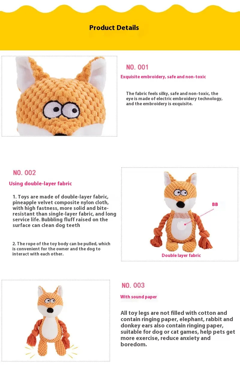 Make playtime more exciting with this Interactive Pet Plush Sound Cotton Rope Toy, specially designed for dogs who love to tug, fetch, and chew. This durable, creative dog toy combines plush material with a built-in squeaker, providing both auditory stimulation and a soft, satisfying texture that pets adore. The strong cotton rope handles make it easy for both you and your dog to engage in a fun game of tug-of-war, helping to build your bond and provide essential physical exercise. Designed to endure tough play, this toy is an ideal choice for interactive games, training sessions, and independent play, encouraging healthy activity and preventing boredom.