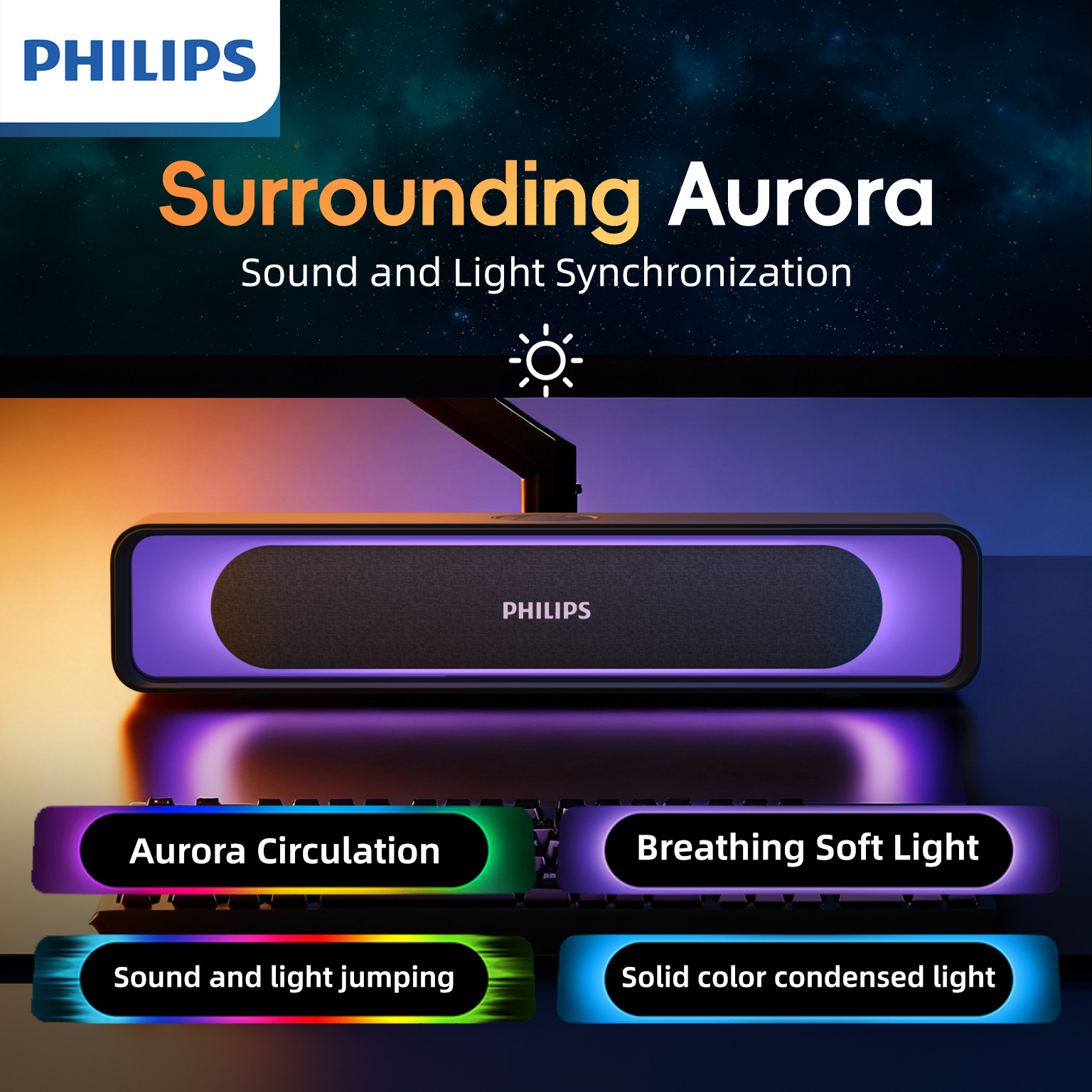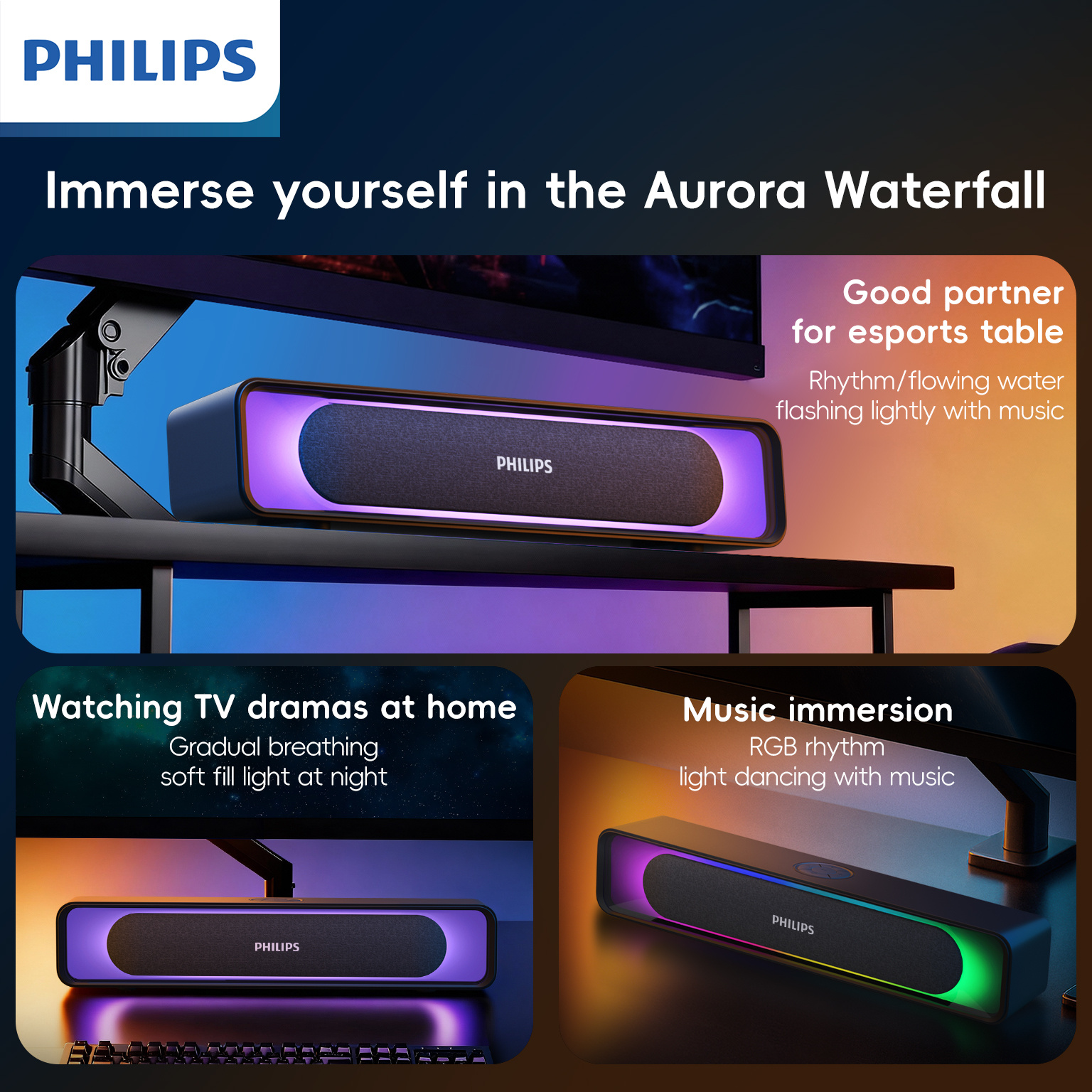 With its RGB ambient lighting, modern low-profile design, and front-facing sound output, this Philips gaming speaker is engineered to sit neatly beneath your monitor, enhancing both your audio performance and desk aesthetics.