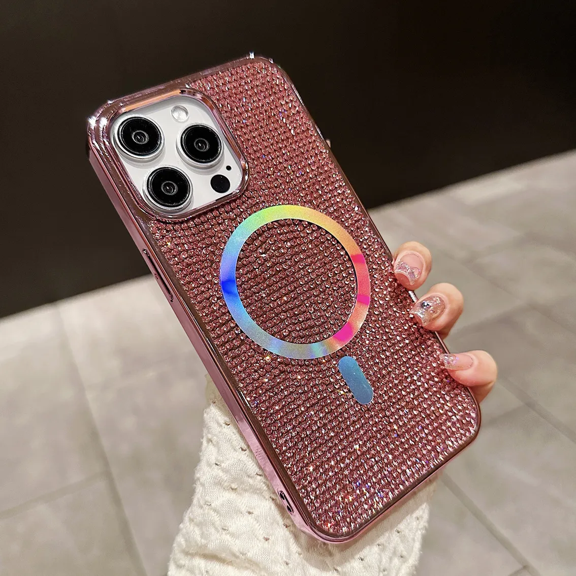 The shiny electroplating frame adds a touch of sophistication, while the embedded rhinestones sparkle beautifully under any light, making your phone stand out in every occasion. Despite its luxurious look, the case maintains a slim and comfortable grip, ensuring both fashion and practicality.