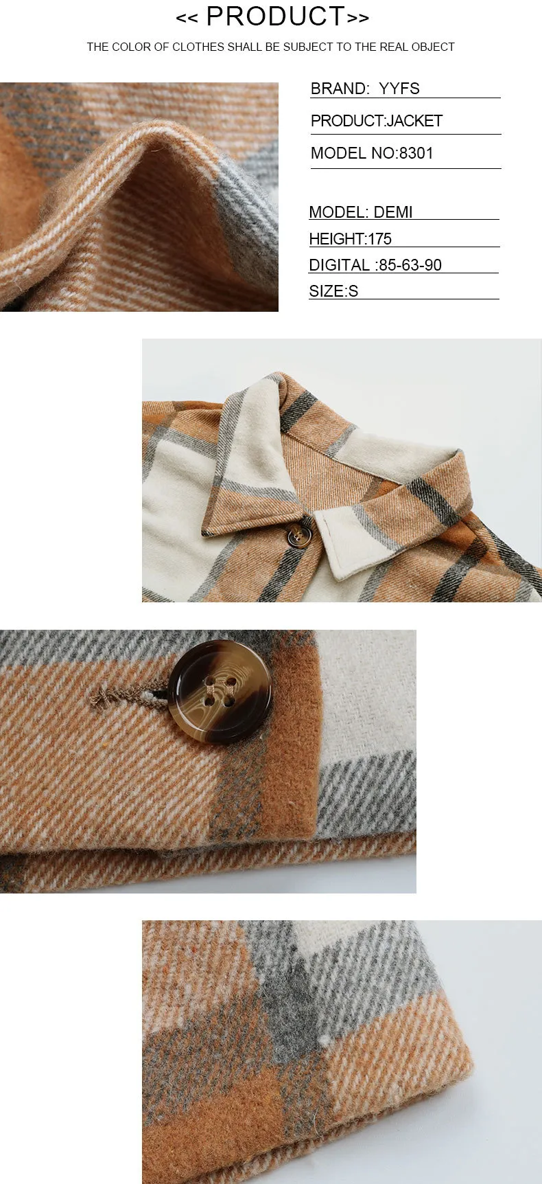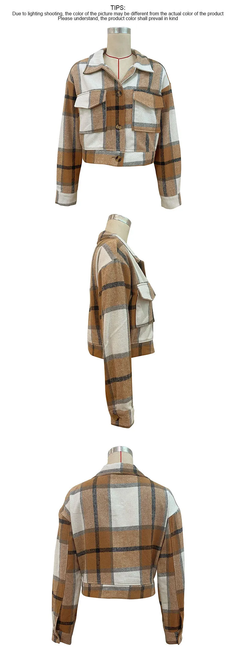 - Design & Aesthetics: The jacket features a classic plaid pattern in various colors like khaki, burgundy, black, and more, paired with a fashionable lapel collar. The cropped cut gives it a modern, trendy edge perfect for casual outings or more formal occasions​(CJdropshipping)​(eBay).