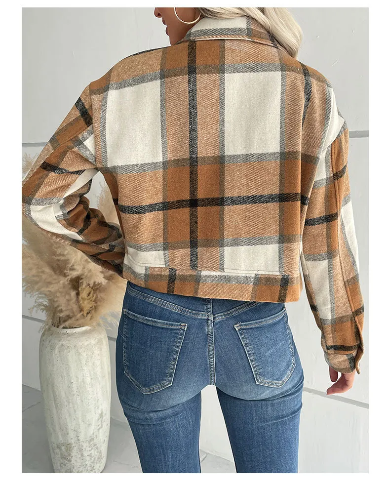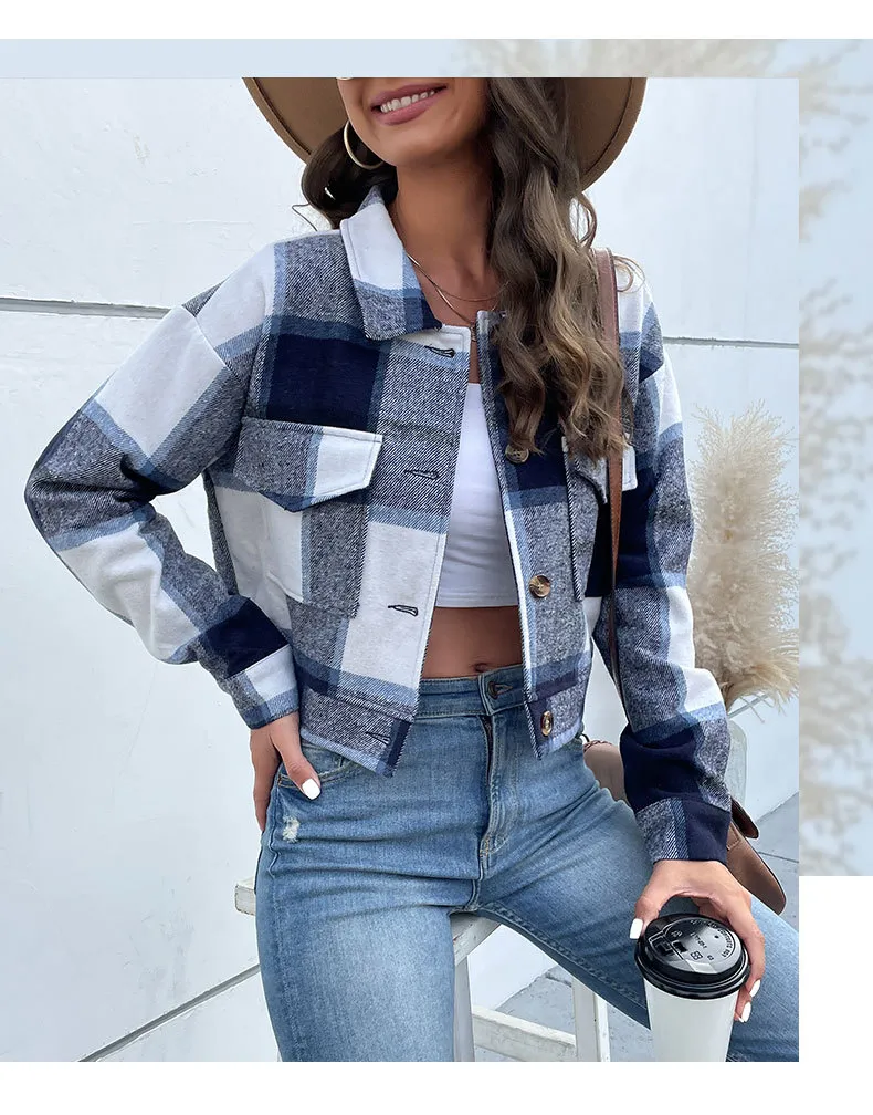 Stylish Plaid Lapel Cropped Jacket with Pockets - The Perfect Fall Outerwear