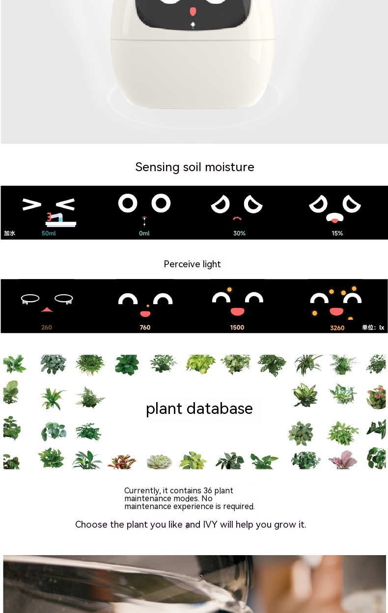 Engaging Plant Care The interactive features and rich expressions make plant care an enjoyable and engaging activity. The Smart Planter AI responds to your touch and environmental changes, creating a dynamic and lively atmosphere.
