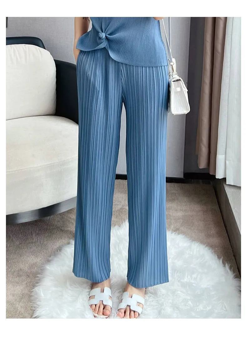 The wide-leg pants are designed to provide maximum comfort while maintaining a fashionable edge. With a loose, flowing cut, these pants offer freedom of movement, making them perfect for everything from running errands to attending a lunch gathering. The wide-leg style is both flattering and trendy, elongating the legs and creating a balanced look when paired with the pleated top. Whether you choose to dress it up with heels or go for a more relaxed look with flats, these pants offer endless styling options.
