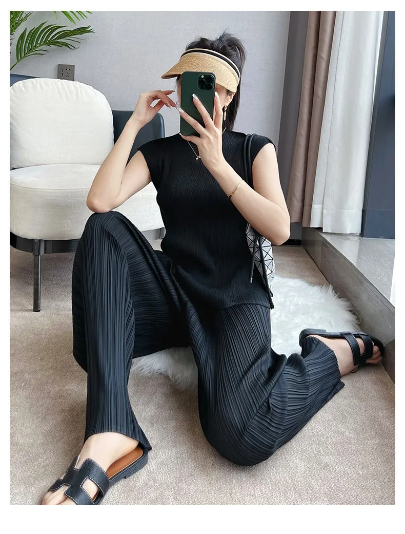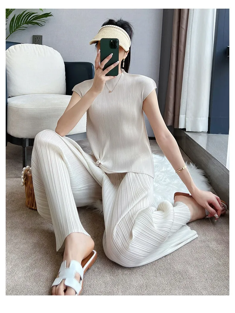 Pleated Summer Clothes Two-Piece Suit: Top & Wide Leg Pants Suit for Women