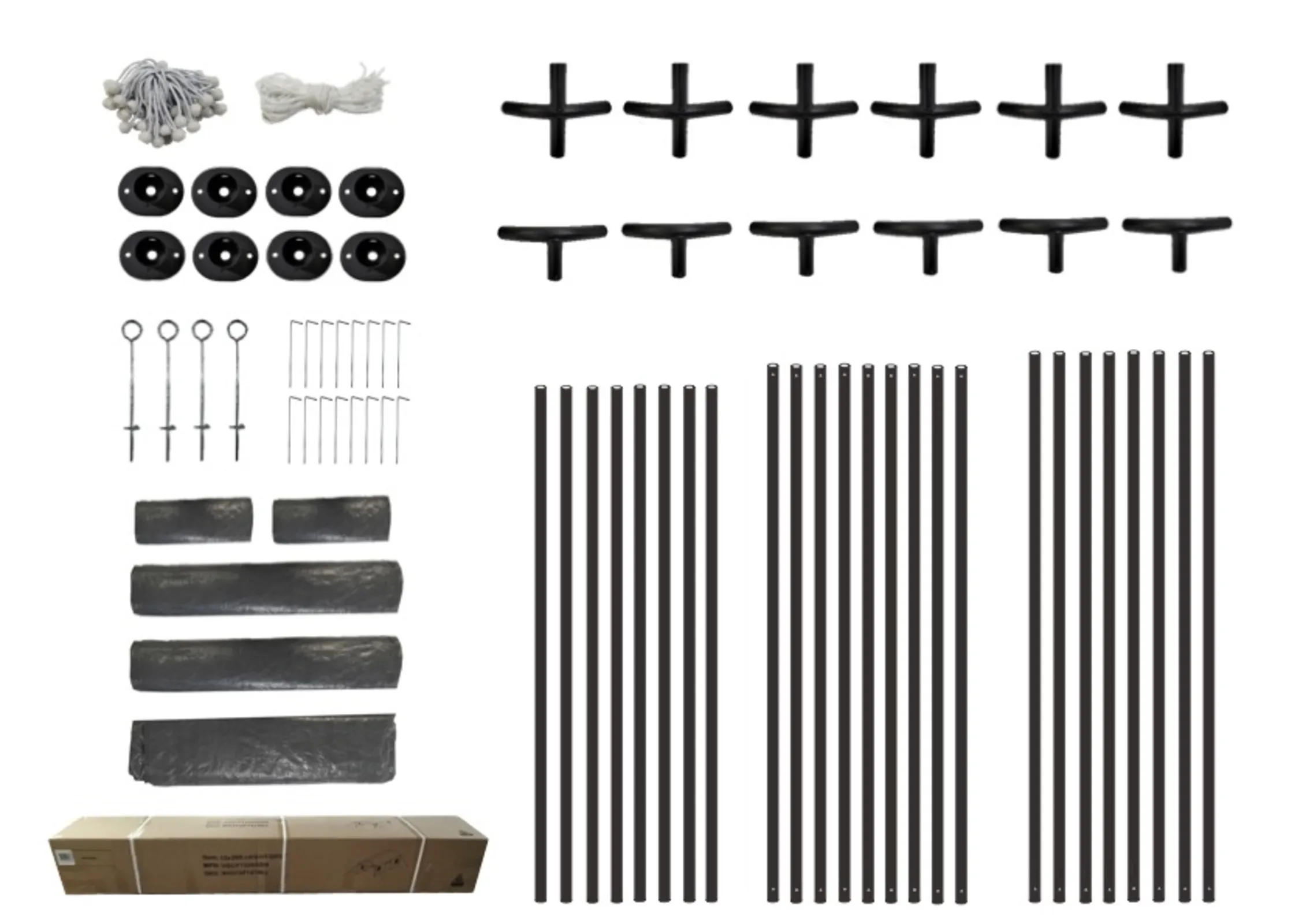 that all parts are included, such as the frame, fabric cover, anchors, and guy ropes.