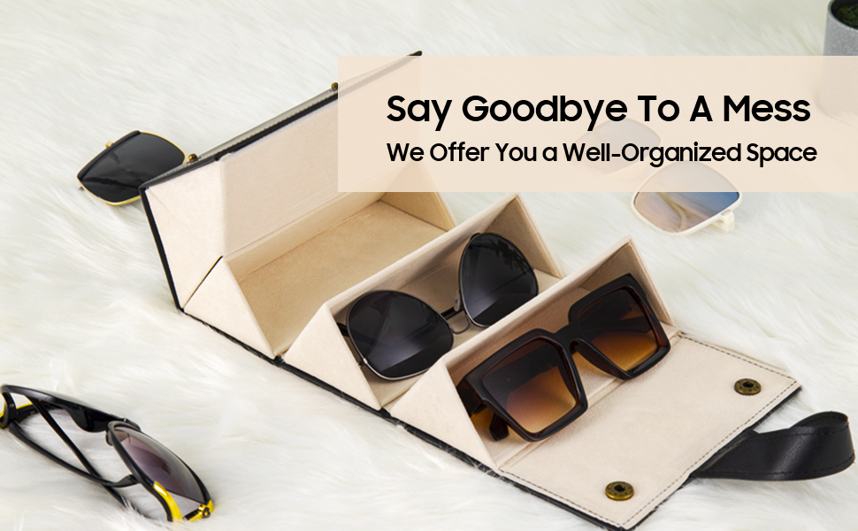 - Travel sunglasses organizer is made of PU leather, sturdy enough, never scratch your lens. Whether it's hanging in the wardrobe at home or folding up on the vanity table, it always meet your collection needs in an perfectly organized style.