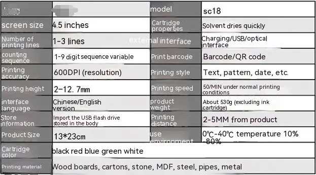 Specification: SC18 universal non-encrypted code-spraying machine with HT01 brand new high adhesion ink cartridge