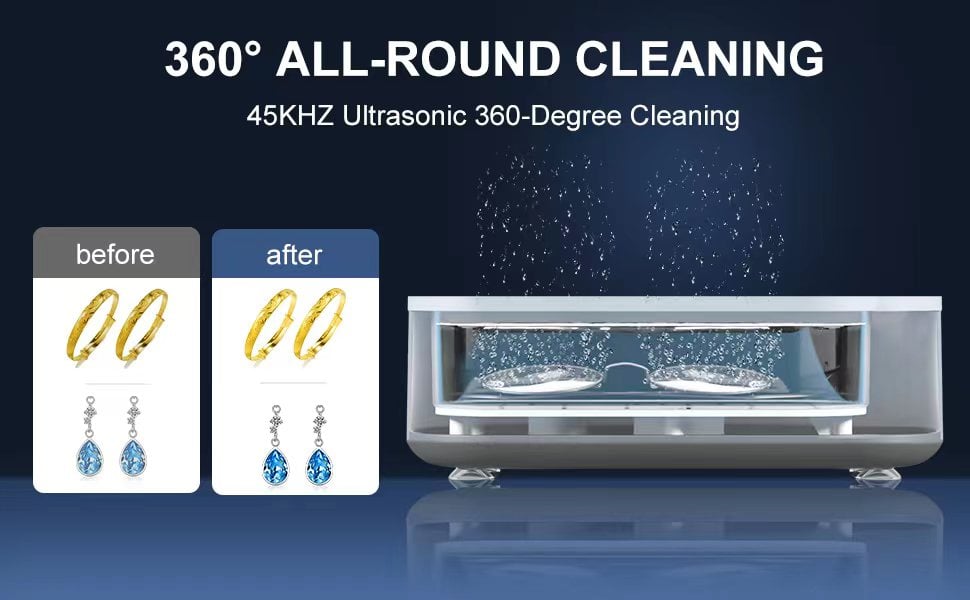 Ultrasonic Cleaner can emit 45000 Hz ultrasonic waves, generate millions of tiny cleaning bubbles to decompose and clean dirt, perform 360-degree cleaning of your items, make your rings or diamonds look like new on special days Glittering.