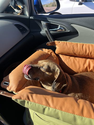 back seats, knowing he is enjoying the ride😊For reference: this is the two seat portable bed, Basil is a Toy Cavoodle that weights about