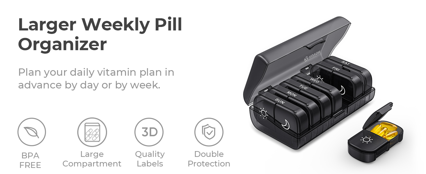 - High Quality: The shell and inner hinges are reinforced for 10,000 uses. The medication organizer letters were UV printed, which is long-lasting for 10,000 times of use, so you do not need to worry about the rub-off labels
