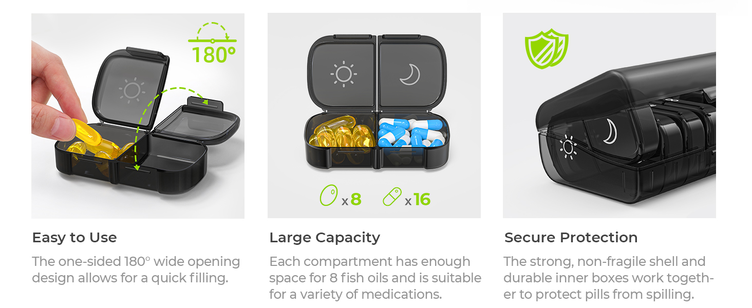 - Portable Designed: Each day of the pill holder can fit in any of your wallet or pockets, and the whole morning and night pill boxes with a black case can protect your medication privacy while holding a week's pills for your travel