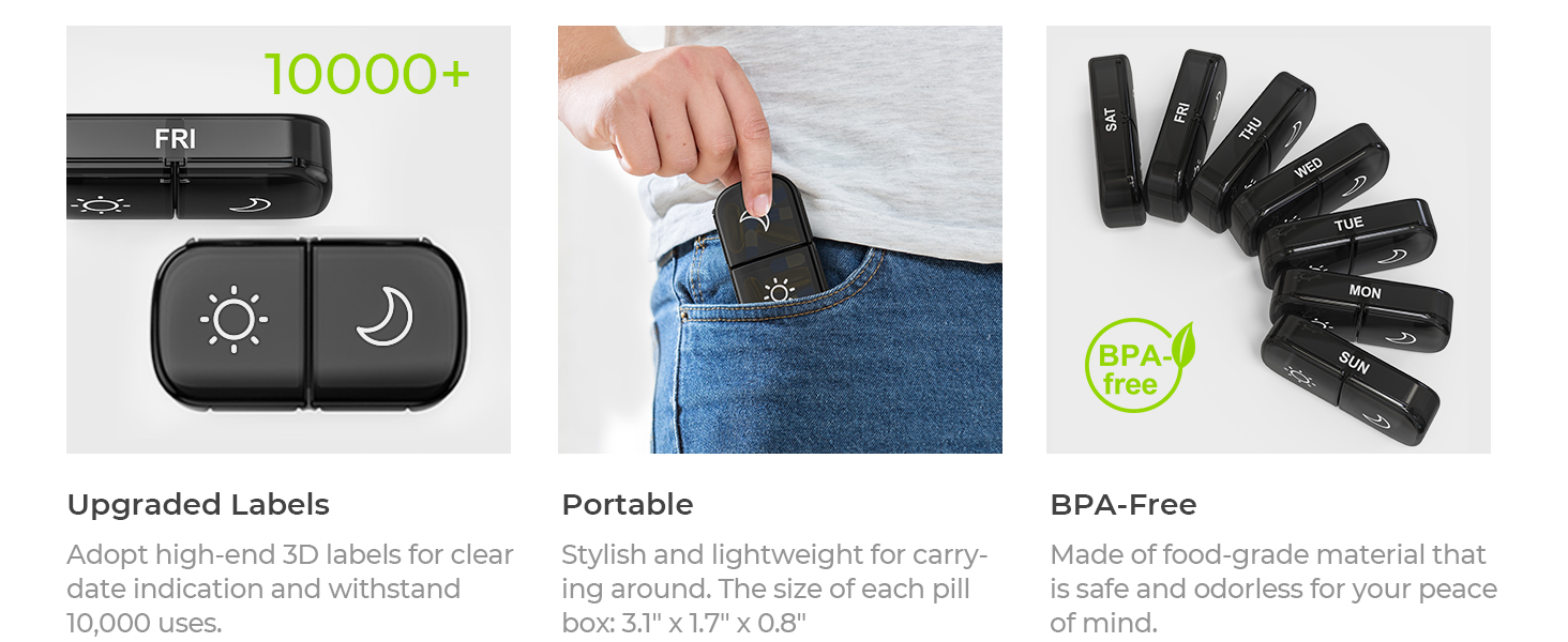 - Portable Designed: Each day of the pill holder can fit in any of your wallet or pockets, and the whole morning and night pill boxes with a black case can protect your medication privacy while holding a week's pills for your travel