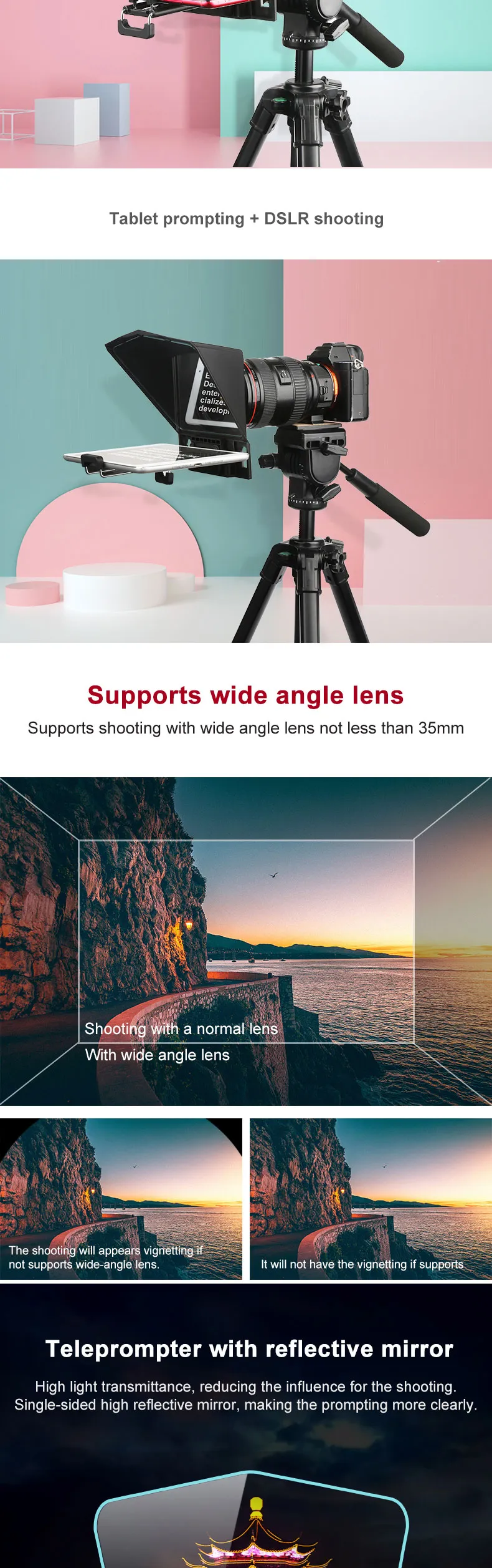 Packing list: teleprompter, mobile phone holder, mobile phone/tablet holder, adapter ring, remote control, hexagon wrench + screws, foam