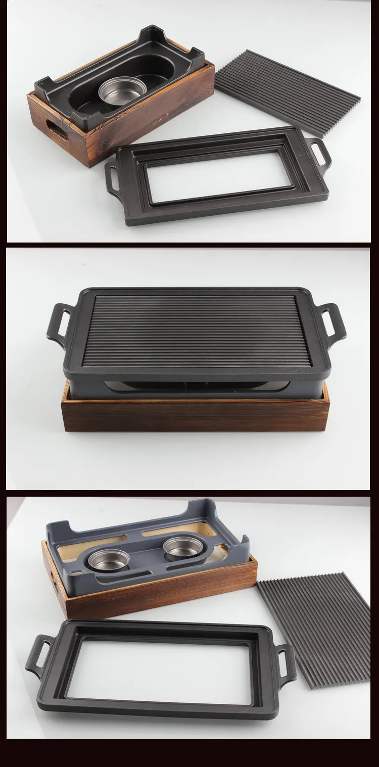 Specifications (Length*Width*Height): 35x21cm wooden-seat rectangular barbecue grill (for 2 people), 28x15cm wooden-seat rectangular