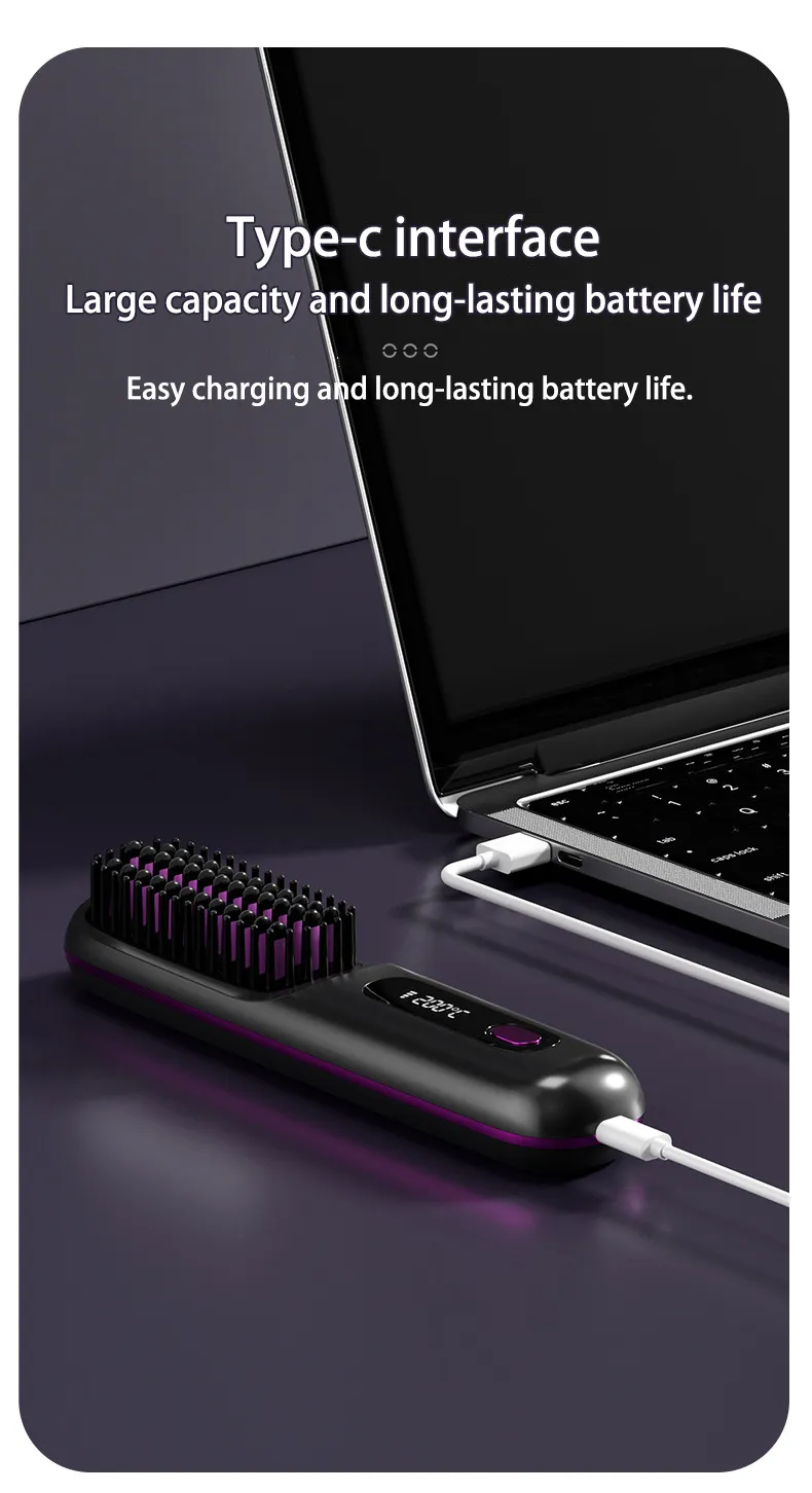 3-4 Uses on One Charge: Powered by a built-in 2000mAh rechargeable battery, this straightening comb delivers 35 minutes of cord-free styling per charge. The LED indicator displays real-time power levels, while the USB-C port enables rapid recharging. To use, select your ideal temperature setting and glide through salon-quality styling effortlessly.