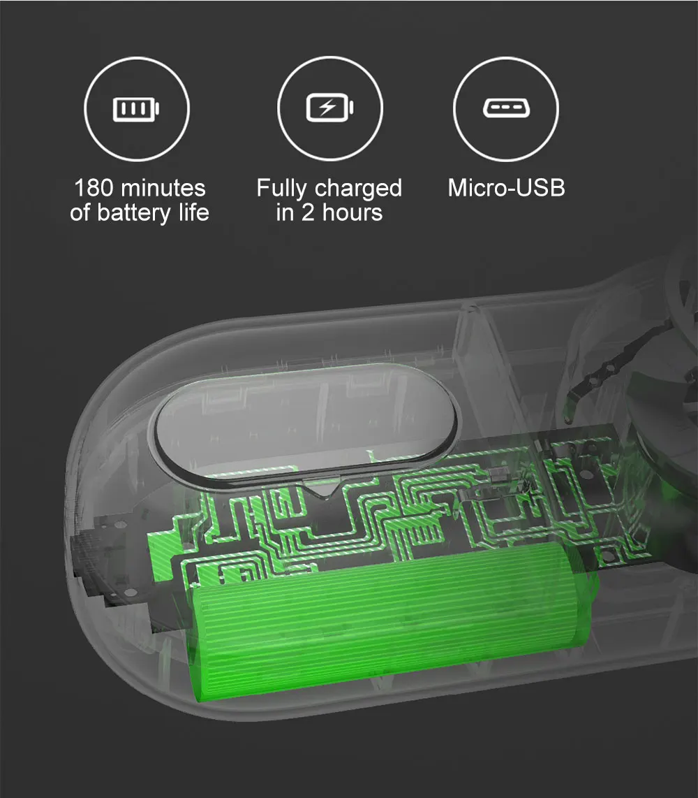 180 minutes of battery life, Fully charged in 2 hours,Micro-usb