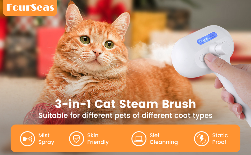 - Multi-Function Pet Grooming Tool This pet steam brush combines de-shedding, steam spray, self-cleaning, and massage functions into one. It effectively removes loose hair from your pet’s coat, reducing tangles and matting, and keeps their fur smooth and soft. Suitable for both long-haired and short-haired cats, it meets all your daily grooming needs, helping to reduce the frequency of baths