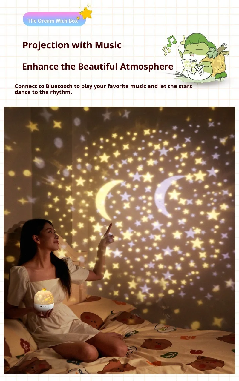 The projector function casts calming patterns and light effects across the ceiling and walls, turning the bedroom into a peaceful, dream-like space. These visuals help capture a child’s attention in a relaxing way, encouraging them to settle down and transition into sleep more easily. Unlike bright lamps or overhead lighting, the projected light remains soft and diffused, supporting rest rather than disrupting it.