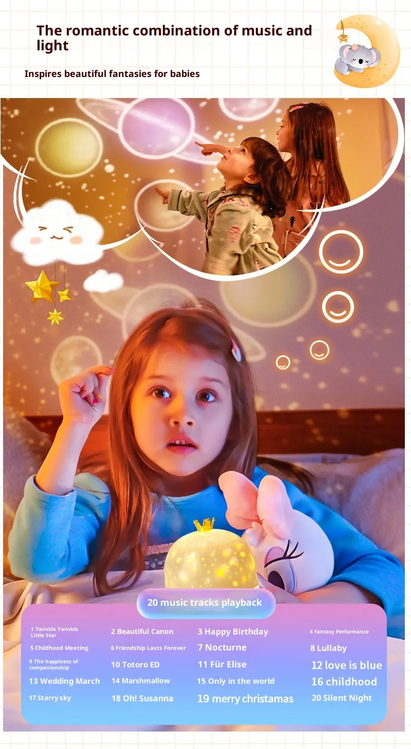 Projects gentle light patterns onto walls and ceilings to create a calming bedtime atmosphere.