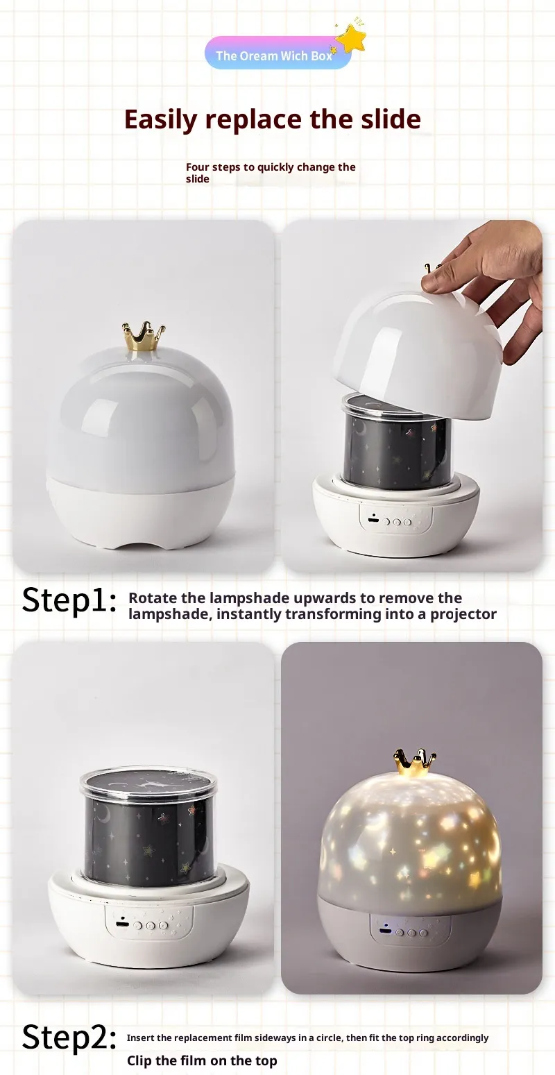 Multi-function Baby Light Projector:Put on the projection film and remove the lampshade, this is a ceiling projector for kids. Remove the projection film, turn on the white light and cover the lampshade, this is a night light for kids room. That emits a soft warm white light and working without noise and glaring.