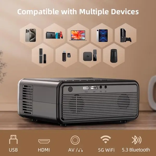 - 【MULTIPLE DEVICES COMPATIBILITY】The home theater projector is equipped with USB, HDMI, AV, and Audio ports, compatible w/TV Stick, Roku, DVD Player, Laptop, USB, Laptop, Headphone, External Speaker, iPad, PS5, etc.