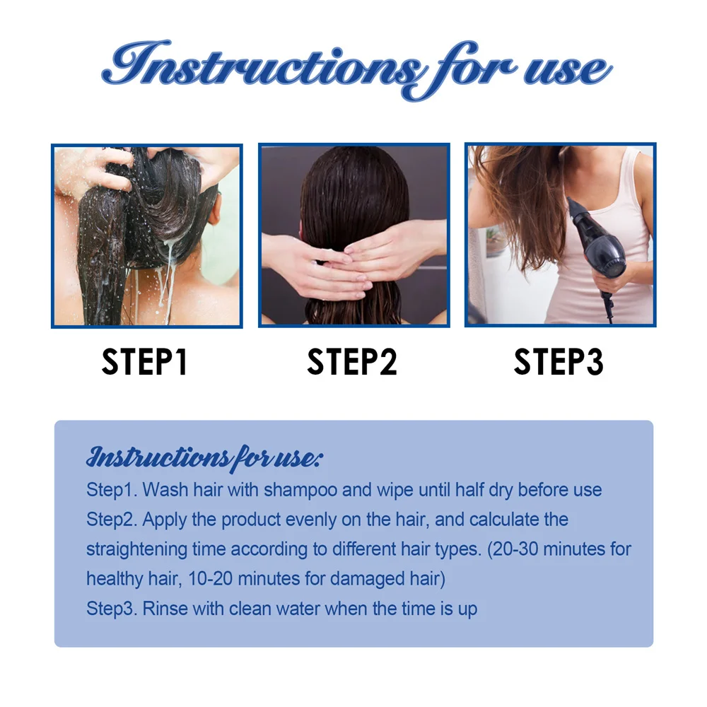 Apply the product evenly on the hair, and calculate the straightening time according to different hair types. (20-30 minutes for healthy hair, 10-20 (20-30 minutes for healthy hair, 10-20 minutes for damaged hair)