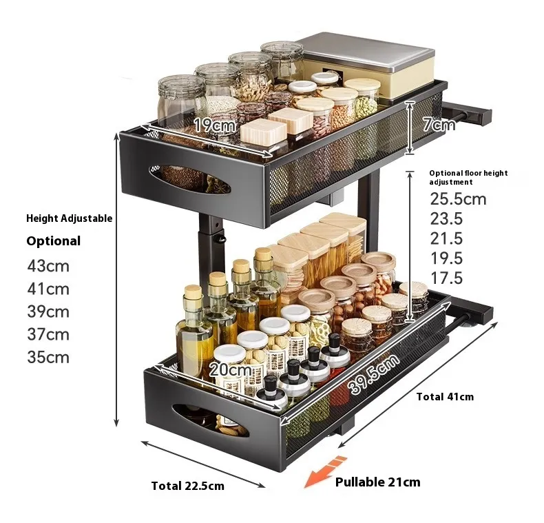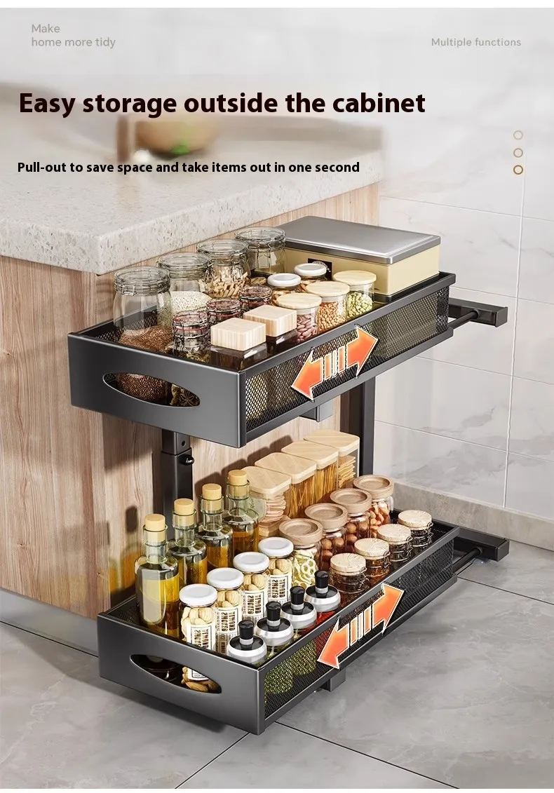 The pull-out double-layer drawer maximizes your kitchen’s storage capacity, making it ideal for kitchens with limited cabinet space or those looking to optimize storage efficiency.