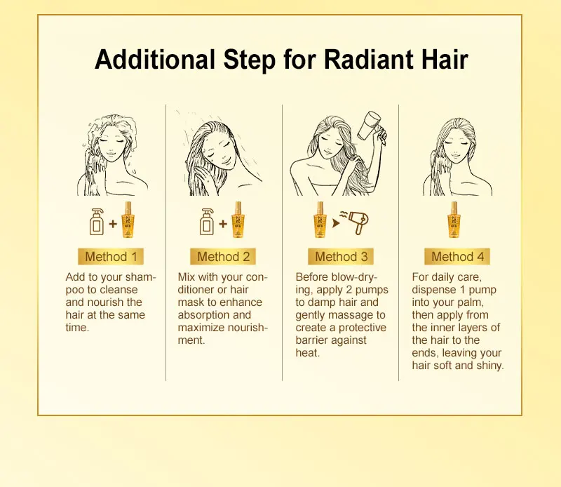 The lightweight oil texture delivers rapid nourishment, offering comprehensive care for dull and dry hair. It imparts a dazzling shine,