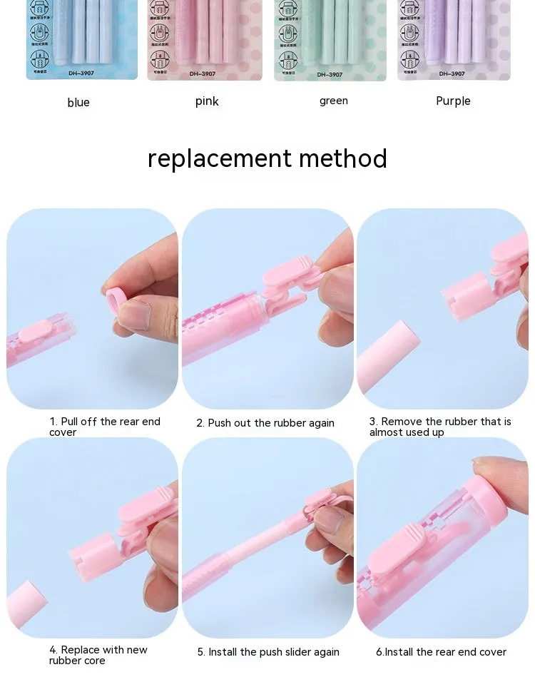 In conclusion, the Push Type Traceless Children's Automatic Eraser is a must-have tool for young learners and budding artists. Offering precision, convenience, and mess-free erasing, this innovative eraser will help children stay focused on their work while keeping their space clean and organized. Its easy operation, traceless technology, and engaging design make it a great tool for home and school use, enhancing the learning and creative experience for kids of all ages.