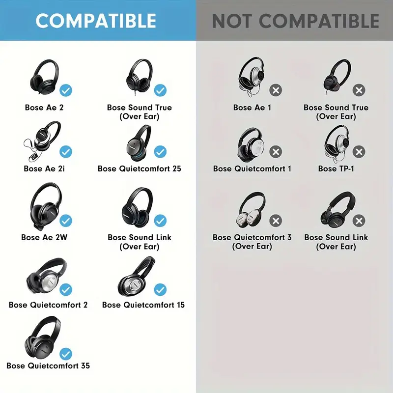 These ear pads are designed to fit various Bose models, including QuietComfort 35 (QC35), QC45, QC35ii, QC25, QC15, AE2, and AE2i. If you have any of these models, these ear pads are the perfect replacement to keep your headphones performing like new.