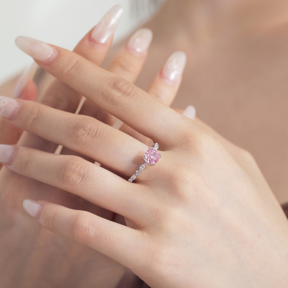 - Dazzling Centerpiece: The ring features a magnificent cushion cut diamond as its centerpiece, available in both stunning pink and classic white options. The cushion cut maximizes the diamond's brilliance, creating a captivating sparkle that draws attention.