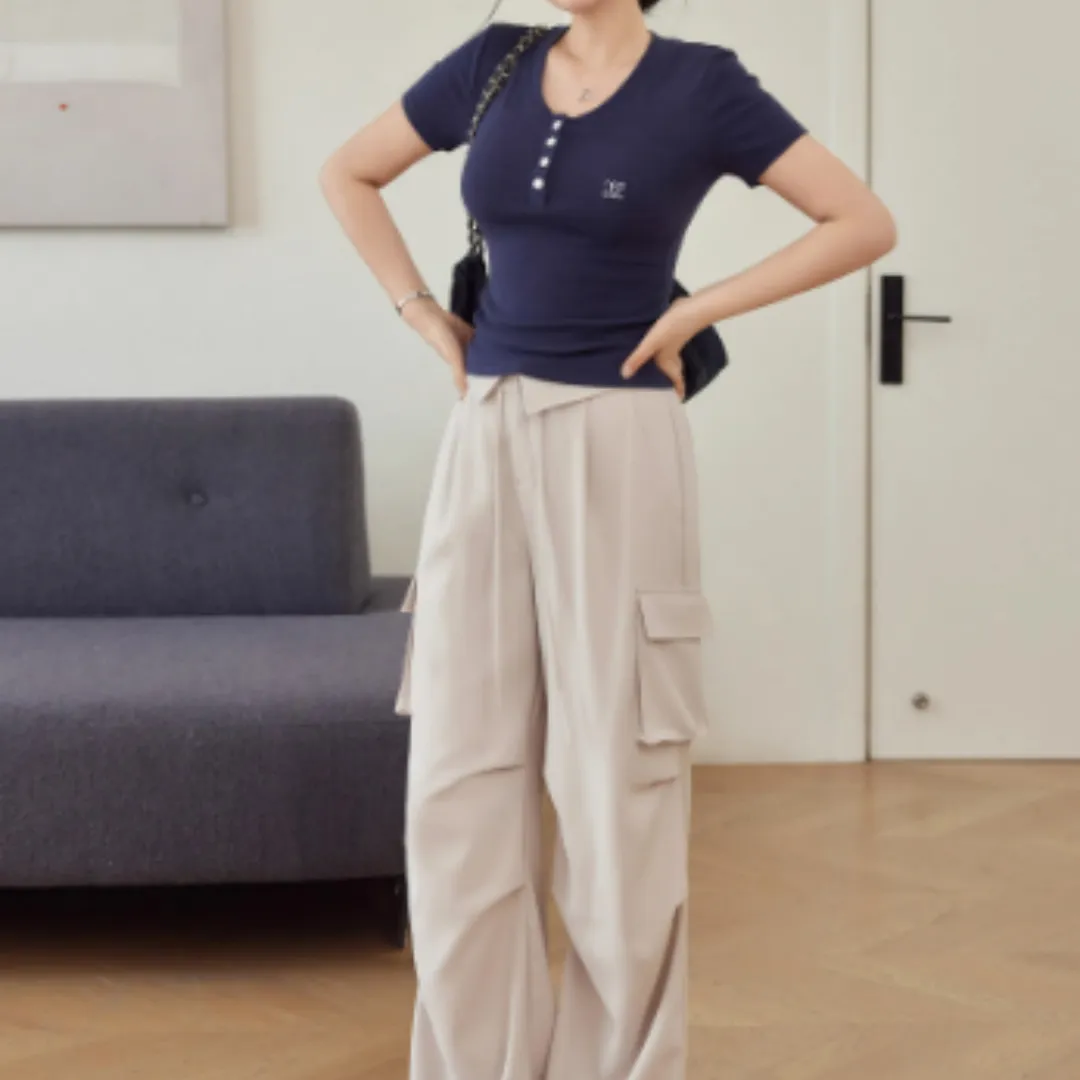 Crafted from a high-elasticity fabric blend, this short-sleeved T-shirt stretches comfortably with your movements while maintaining its shape throughout the day. The slimming cut gently contours the waist and torso, providing a sleek, streamlined look without feeling restrictive.