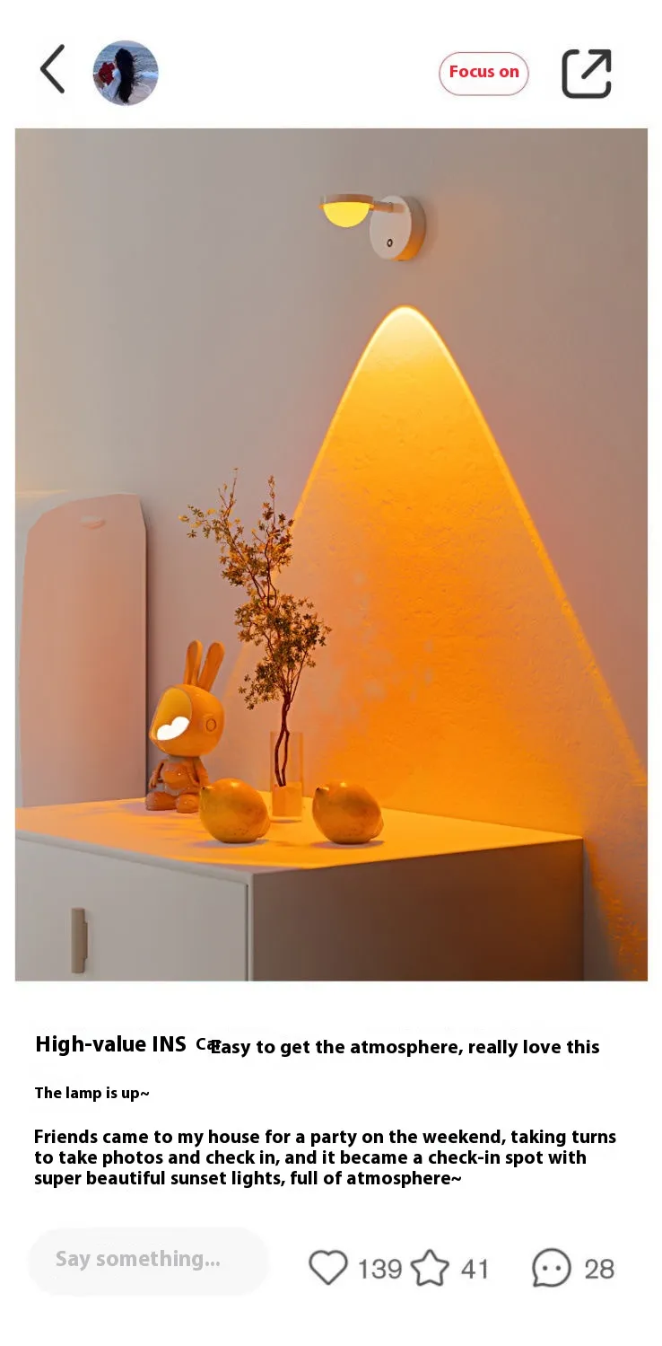 The Rechargeable Sunset Red Wall Lamp is an ideal way to bring warmth, beauty, and relaxation to your space. With its easy-to-use design, rechargeable function, and stunning sunset glow, this lamp is the perfect addition to any room in your home. Whether you're creating a relaxing atmosphere in the bedroom, enhancing your living space, or giving a thoughtful gift, this installation-free lamp will light up your life with warmth and style.