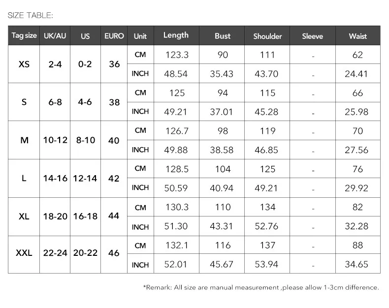 allow 2-3cm differences due to manual measurement. 2. Please check the size chart carefully before you buy the item, if you don't know how