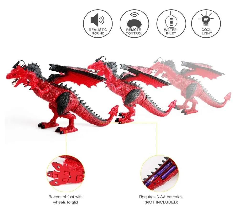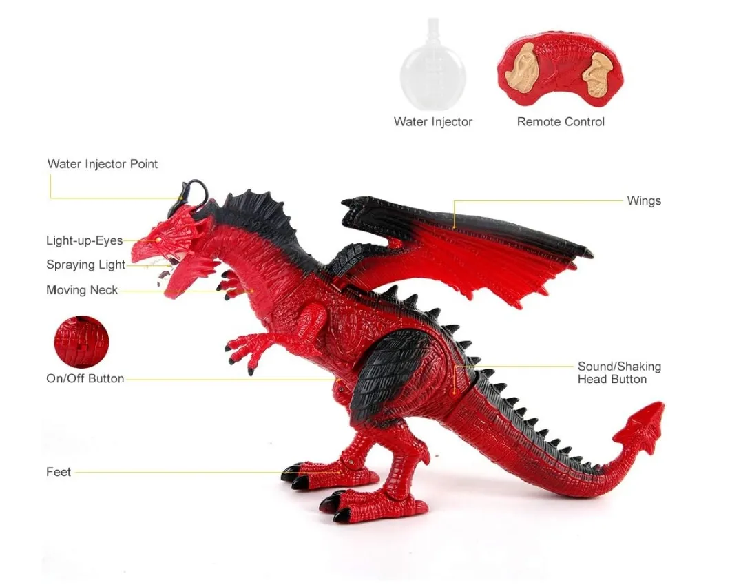 The included remote control is designed to be easy for young children to use, with clearly marked buttons for controlling movements, spray effects, and sound functions. The simple controls allow kids to guide their dragon in various directions, perform actions, and activate special effects with ease. This user-friendly remote encourages independent play and exploration.