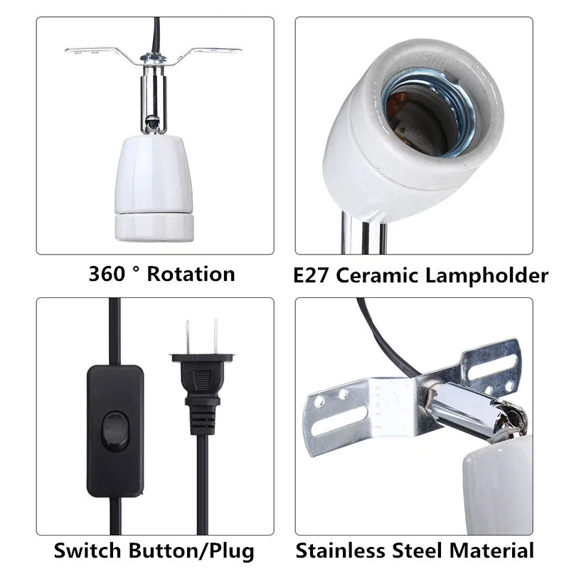 Constructed with durable ceramic and metal materials, this lamp holder ensures excellent heat resistance and longevity. The rotatable design allows for 360-degree rotation and 180-degree vertical adjustment, enabling precise positioning of the light source to create optimal basking spots. The included on/off switch provides convenient control, and the 1.6-meter cable offers flexibility in placement. This lamp holder is suitable for use in terrariums, vivariums, and other enclosures, making it an essential tool for reptile enthusiasts.