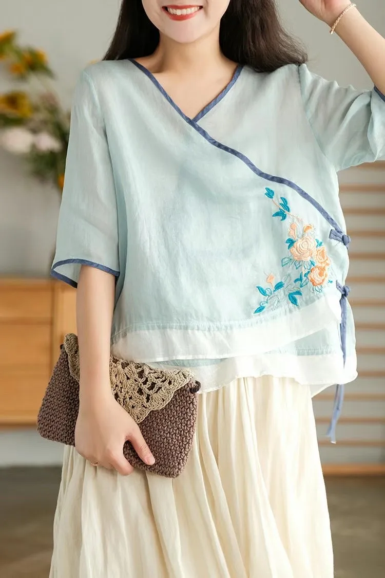 Retro Button Embroidered Shirt Top