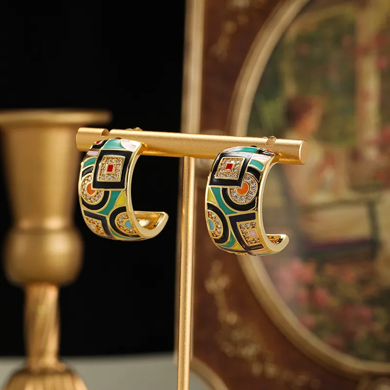 Retro Color Enamel C- Shaped Stud Earrings For Women