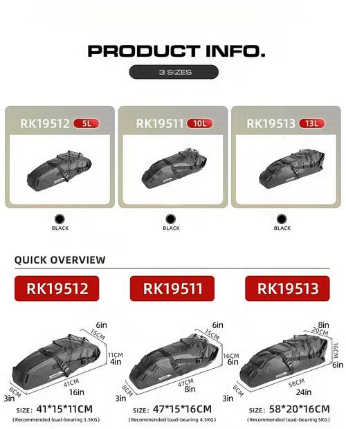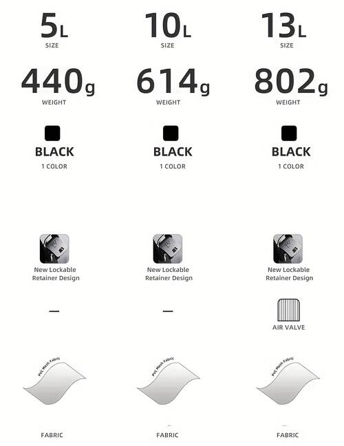 5L-10L-13L Capacity Options: The bag is available in 5L, 10L, and 13L sizes, providing a flexible storage solution for