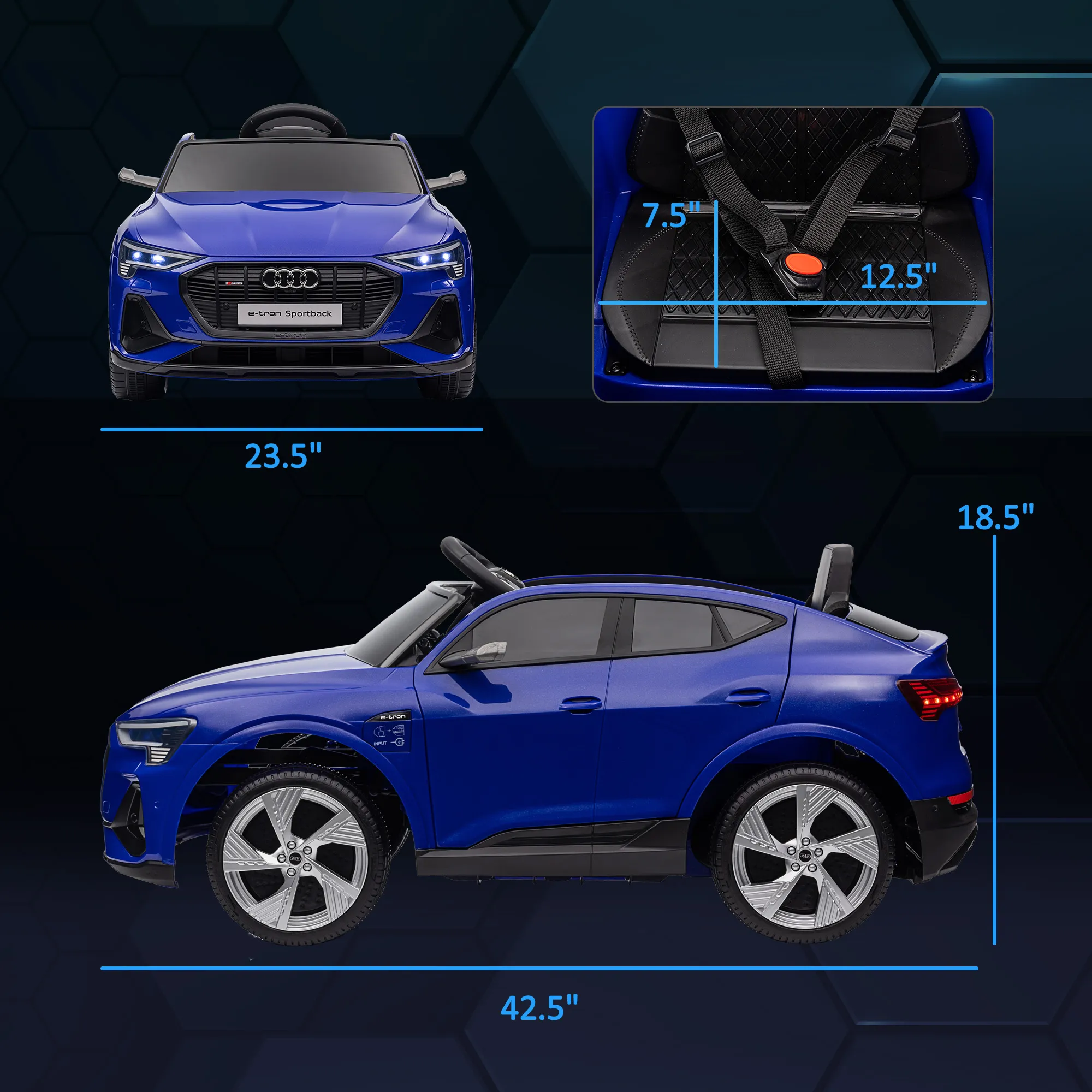 Do you have a child who aspires to be a driver? This Aosom 12 volt ride-on toy could be the perfect present. This ride-on toy runs almost like a real sports car with many realistic features such as adjustable speeds (1.86-3.1 mph), lights, music player, steering wheel, and horn that gives your kids an authentic driving experience. Extra-wide smooth wheels will keep them safe and steady while going. Make your child feel like they are driving in style with this ride-on sports car from Aosom. Features: - Realistic looking car with a horn, music, LED headlights, and taillights strips - Includes 2 small auxiliary wheels for easy transport while battery runs out - Can ride at speeds adjustable for 1.86-3.1 mph - Extra-wide tires, four-wheel suspension for secure and smooth driving - 12 V dual motor for a powerful drive and 45 mins of continuous driving off a single charge - Includes both manual and remote control so kids or parents can direct the vehicle - USB, MP3, and TF card slot for music - Separate horn and music buttons for loud and clear audio - Power indicator monitors show how much power is remaining Specification: - Color: Red, Black - Material: PP, Steel - Overall Dimensions: 42.5" L x 23.5" W x 18.5" H - Seat Dimensions: 12.5" L x 7.5" W x 9.75" H - Wheel Dimensions: Ф 8.75" x 3.25" W - Charging Time: 8-12 hours. - Run Time: 45 minutes (depending on the type of use) - Speed: 1.86-3.1 mph - Battery: 12 V / 4.5 AH x 1 - Weight Capacity: 55 lbs. - Recommended Age: 3-5 years. - Approved Age: 3-8 years - Item Label: 370-172V80RD - Note: Always monitor your child while they are riding. 2 x AAA batteries not included. Package Includes: - 1 x Ride on Car - 1 x Instruction Manual Do you have a child who aspires to be a driver? Features: - Realistic looking car with a horn, music, LED headlights, and taillights strips - Includes 2 small auxiliary wheels for easy transport while battery runs out - Can ride at speeds adjustable for 1.86-3.1 mph - Extra-wide tires, four-wheel suspension for secure and smooth driving - 12 V dual motor for a powerful drive and 45 mins of continuous driving off a single charge - Includes both manual and remote control so kids or parents can direct the vehicle - USB, MP3, and TF card slot for music - Separate horn and music buttons for loud and clear audio - Power indicator monitors show how much power is remaining Specification: - Color: Black - Material: PP, Steel - Overall Dimensions: 42.5" L x 23.5" W x 18.5" H - Seat Dimensions: 12.5" L x 7.5" W x 9.75" H - Wheel Dimensions: Ф 8.75" x 3.25" W - Charging Time: 8-12 hours. - Approved Age: 3-8 years - Item Label: 370-172V80BK - Note: Always monitor your child while they are riding. Package Includes: - 1 x Ride on Car - 1 x Instruction Manual.