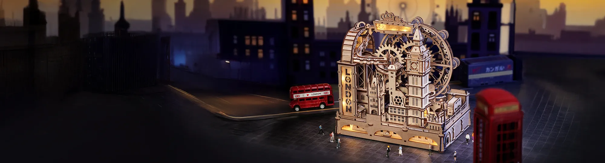 Experience the perfect combination of creativity, engineering, and decoration with the ROBOTIME 3D Wooden Puzzle – London City Mechanical Model. Designed for adults and teens, this DIY kit lets you assemble a detailed miniature London cityscape complete with moving mechanical parts, a marble run, and optional LED lights for a dazzling display.