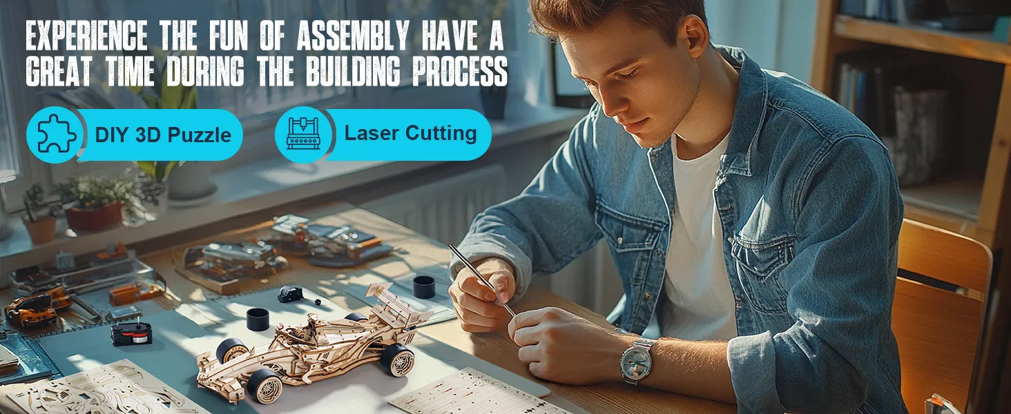 - 【Engine Roaring Sound】This wooden model kits for adults features a powerful built-in system with a 45-degree steering angle, simulating the real engine sound of a race car, making you feel like you're on an actual racetrack.
