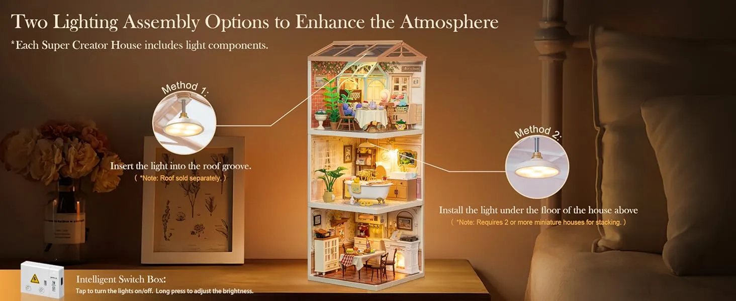 - [Lighting Options & Connectivity] - Enhance your creation with integrated lighting components. Easily install lights in the roof slots or beneath the floor for a glowing effect. Type-C ports allow you to connect multiple units for synchronized lighting, powered by a 5V supply. Dustproof roofs and doors are sold separately.